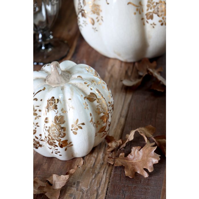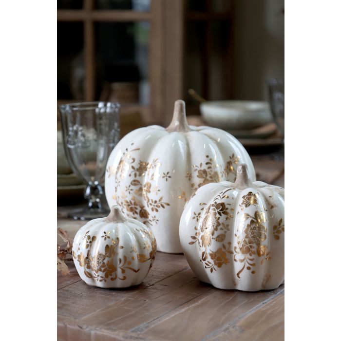 Skapa en stämningsfull känsla i hemmet med denna eleganta pumpa i keramik. Den är målad i en vacker kombination av antik mässing och vit, vilket ger en sofistikerad och tidlös look. Pumpan finns i två olika utföranden samt i flera storlekar, perfekt att kombinera tillsammans för en harmonisk helhet. En dekorationsdetalj som passar lika bra året runt som till höstens mysiga dukningar.