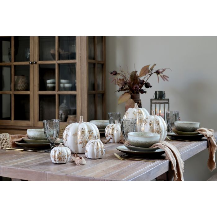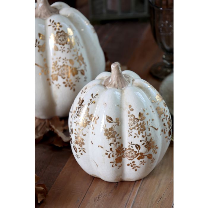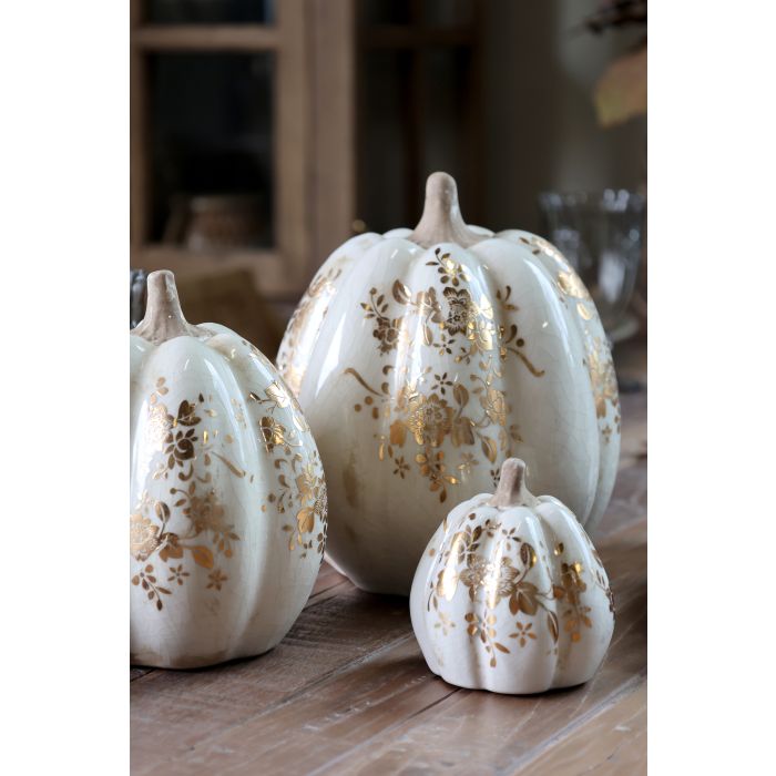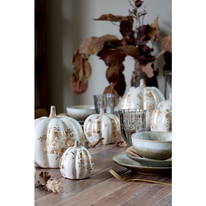 Skapa en stämningsfull känsla i hemmet med denna eleganta pumpa i keramik. Den är målad i en vacker kombination av antik mässing och vit, vilket ger en sofistikerad och tidlös look. Pumpan finns i två olika utföranden samt i flera storlekar, perfekt att kombinera tillsammans för en harmonisk helhet. En dekorationsdetalj som passar lika bra året runt som till höstens mysiga dukningar.