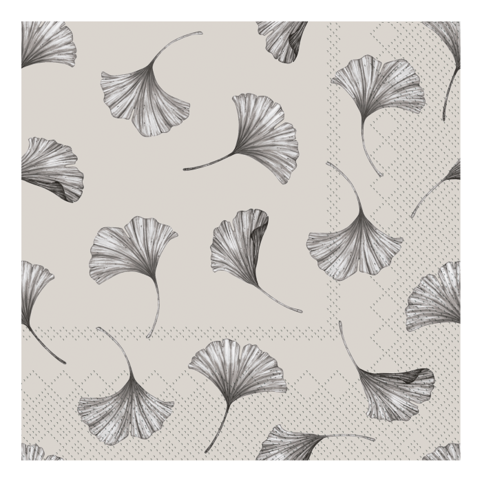 Denna vackra servett med ett stilrent bladmönster i fransk grå ton ger dukningen en lugn och sofistikerad känsla. Perfekt för både vardag och fest, och enkel att matcha med både porslin och ljus i olika färger.
