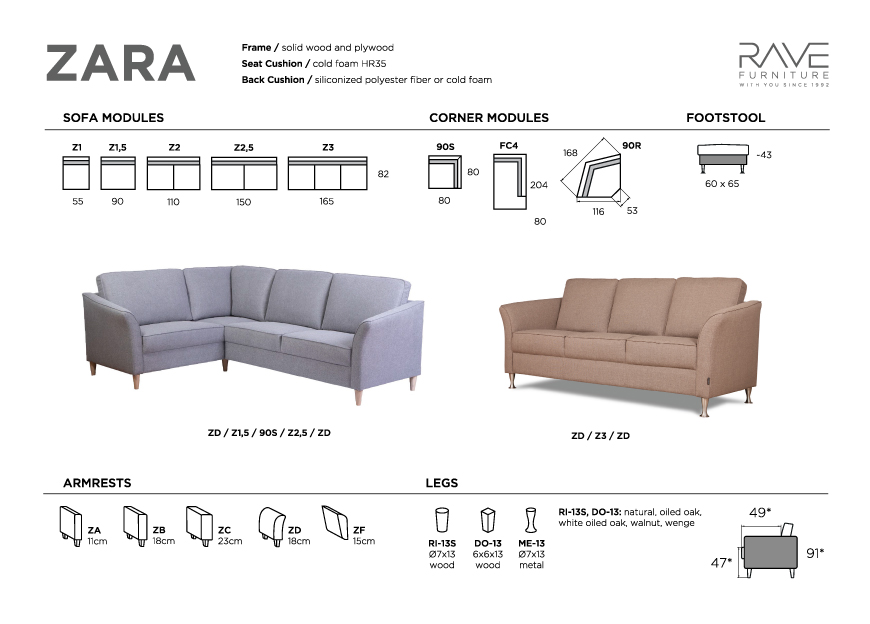 Sittdynorna är fyllda med kallskum HR35. Ryggdynorna är fyllda med silikoniserad polyesterfiber och en blandning av skum.